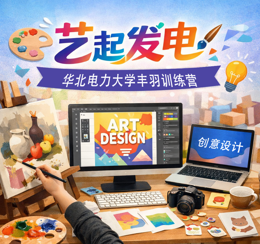 项目简介:“艺起发电”依托丰羽训练营平台,聚焦高校美育育人功能。项目以绘画基础、视觉设计(PS)、新媒体排版与文创实践为主要内容,通过“艺术学习 + 实操创作 + 成果转化”的方式,引导学生提升审美素养、创新意识与表达能力。项目注重过程体验与成果展示相结合,将艺术创作转化为可传播、可应用的作品,探索美育赋能学生全面发展的实践路径。